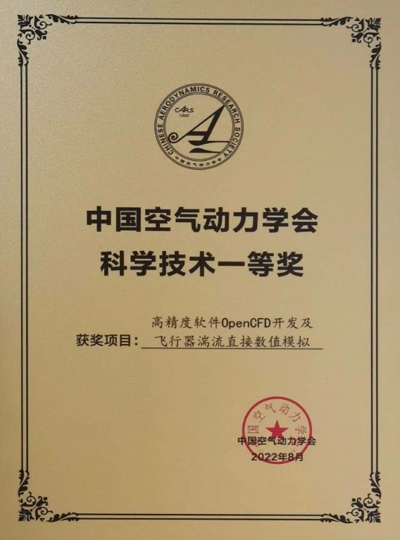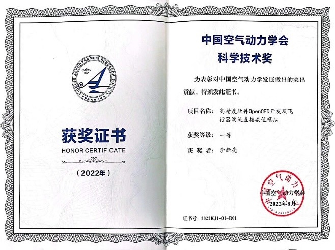 获奖信息: 李新亮,于长平,童福林,刘洪伟,袁先旭,“高精度软件OpenCFD开发及飞行器湍流直接数值模拟”,2022年度中国空气动力学会科学技术一等奖(自然科学类),2022KJ1-01-001。