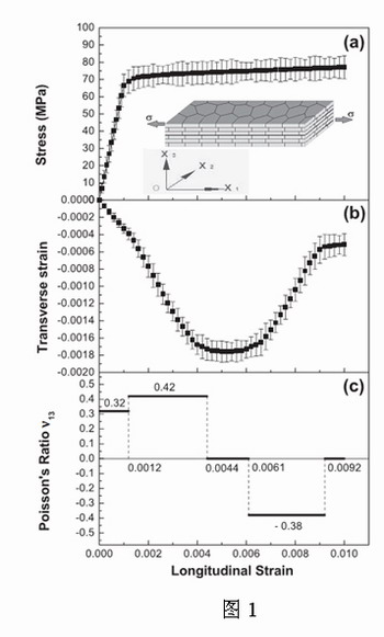 图1:珍珠母拉伸的(a)应力—应变曲线; (b)对应的横向应变曲线; (c)对应的Poisson比变化。 |