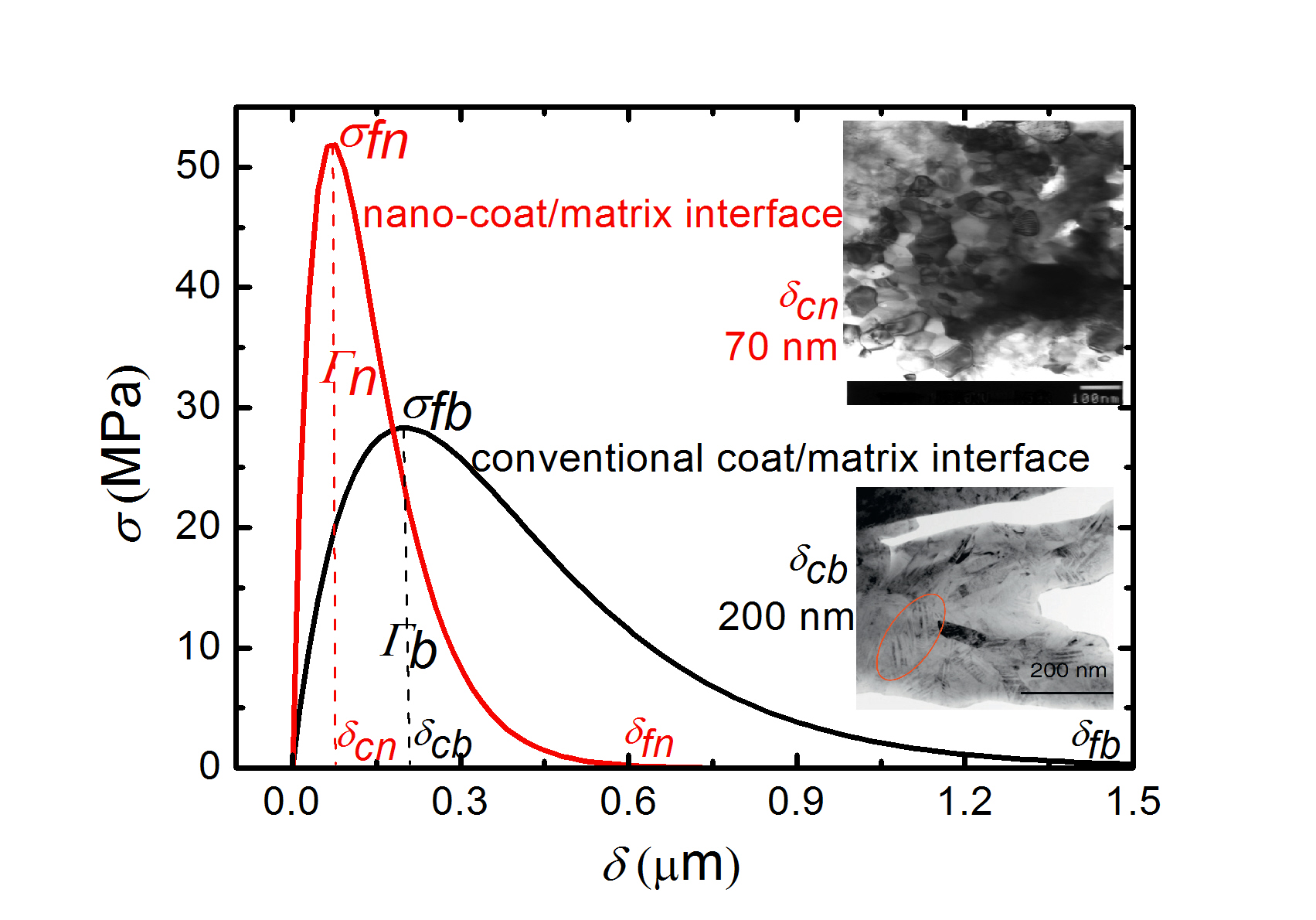 涂层/基底体系界面粘聚的应力-位移关系,纳米结构涂层与基底间界面强度提高、临界位移(对应微结构尺度)减小