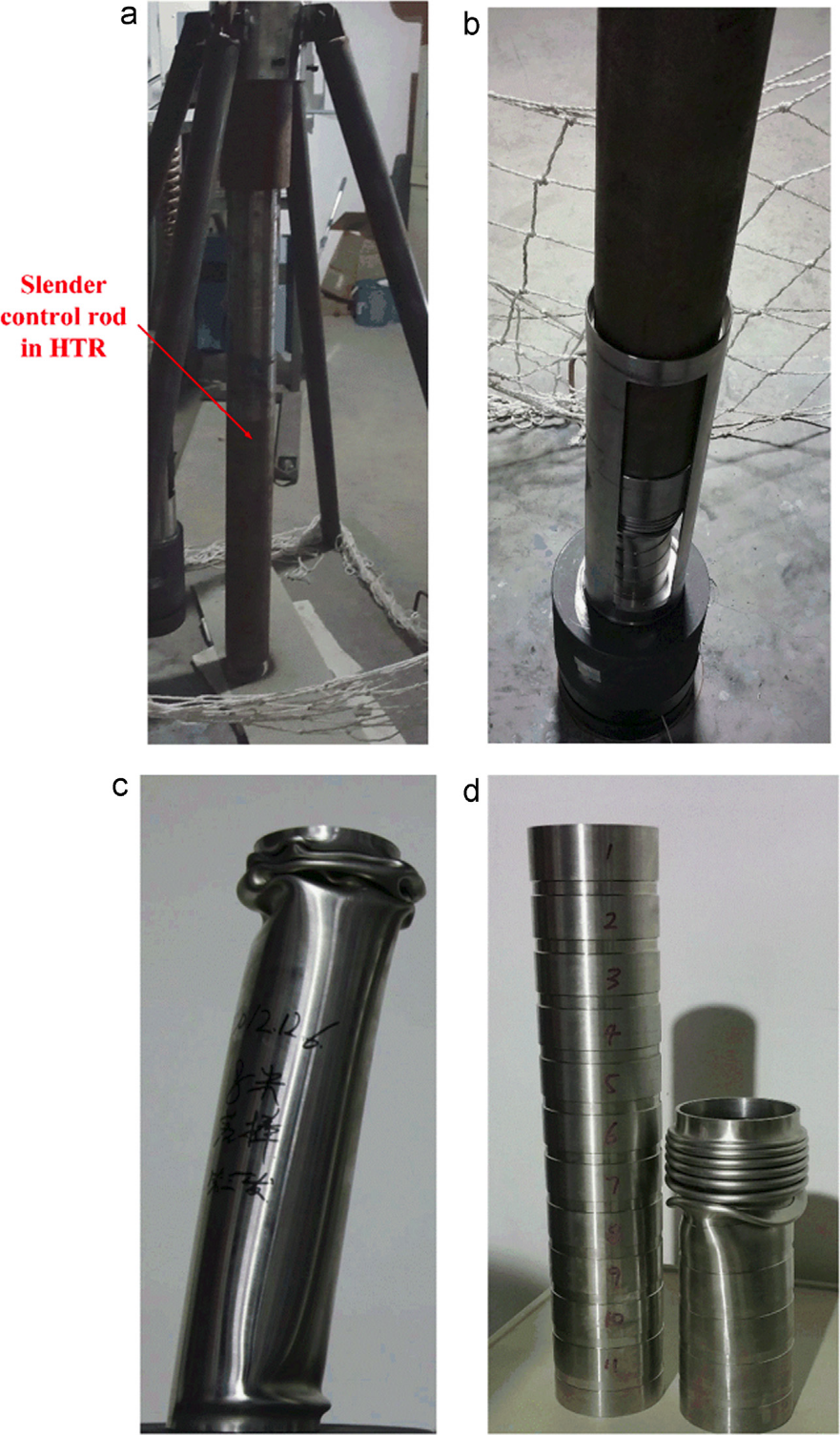 图4原型验证实验a)模型试验中的细长控制棒b)控制棒冲击梯度缺陷筒c)完整筒受控制棒冲击发生欧拉失稳d)梯度缺陷筒的圆环形屈曲模式 LMFS供稿 |