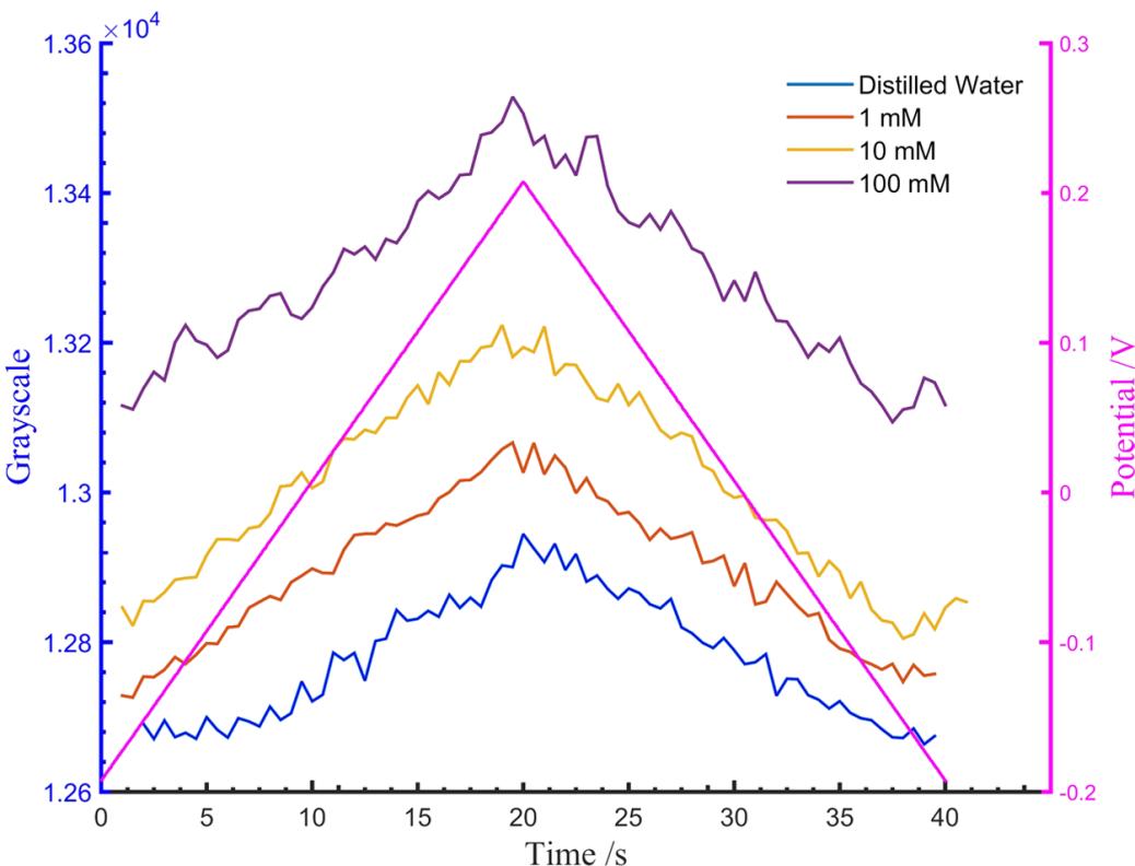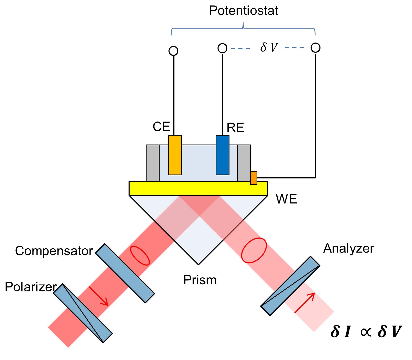 电偏置相敏成像传感器可以在固相表面施加不同电化学条件,同时以偏振光波为探测光照射该表面。在全内反射模式下,入射光波在固相表面上发生全反射,此时固相表面会对入射光波进行调制,进而引起反射光偏振态的改变。通过比较光波偏振态的改变,便能推导出固相表面的微小变化,实现对界面处厚度仅为亚纳米量级的超薄膜层的测量。目前,该传感器已经成功用于固液界面处分子吸附与脱吸附过程的实时原位监测。在固液界面处,由于两相电势的不同,会形成自发电势。施加电势后,界面电荷平衡被打破,界面处的电势会发生变化;另一方面,分子吸附与脱吸附行为也会影响界面处的自发电势并导致固相表面性质的改变。因此,为了准确地监测分子在固相表面上的吸附和脱吸附行为,就必须去除外加电势对固相表面的影响。