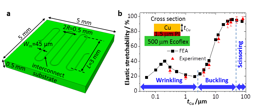 之前的可延展结构设计主要为曲线“薄膜”结构(图2a),宽度一般在几十微米,厚度在几百纳米到1~2微米,在整体拉伸变形的情况下,结构发生褶皱变形或侧向屈曲。近日,中科院力学所柔性结构与器件课题组与美国伊利诺伊大学香槟分校及美国西北大学等学校的科研人员合作,另辟蹊径,提出了非屈曲结构设计,即将导线的厚度增大到与宽度同一量级,数值计算和实验测试均发现其延展性大大提高(图2b),优化值可以达到350%,是目前薄膜结构达到的最大值(60%)的6倍。同时,由于导线厚度的增加,其电阻大大较小,为电子器件提供了良好的电学性能和热学性能。