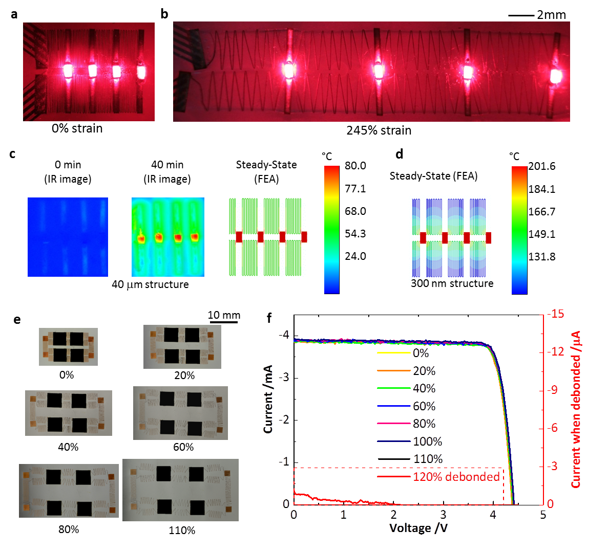 鉴于其优良的力学、电学和热学性能,非屈曲结构被应用于三种可延展柔性电子器件的研制中:1)可延展LED阵列。其拉伸前构型如图3a所示,整体拉伸245%后仍能正常工作(图3b)。另一方面,相对于薄膜结构,其厚度增加电阻减小,生成热也大大减小,与厚度为300纳米的结构相比,其最高温度由200多度降低到80度,展示了其良好的热学性能。2)可延展太阳能电池。图e展示了基于非屈曲结构的太阳能电池的变形情况,在整体拉伸应变从0增加到110%的过程中,电池性能稳定不发生变化(图2f)。3)可用于皮肤电子通讯的可延展柔性天线(不再详述)。