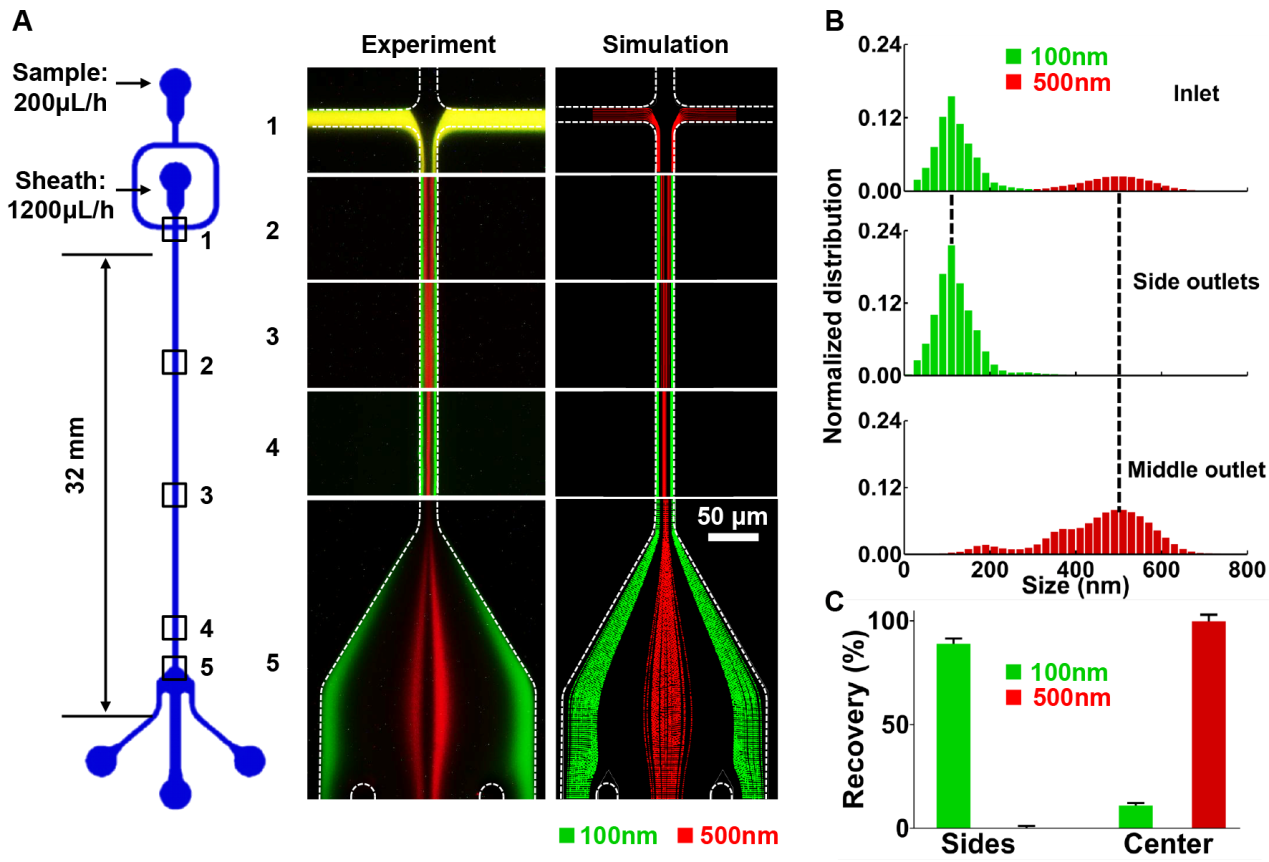 图1 微流控芯片的结构示意图及不同尺度纳米颗粒分离的实验观测与数值模拟对比