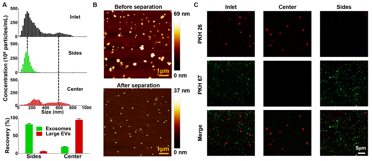 近期,力学所非线性力学国家重点实验室胡国庆研究员等在外泌体(exsomes)的微流控分离研究方面取得重要进展。外泌体是细胞经过"内吞-融合-外排"等一系列调控过程而形成的细胞外纳米级小囊泡,可携带蛋白质,运送RNA,在细胞间物质和信息转导中起重要作用。然而,由于外泌体的微小尺度(30~200纳米),将其从含有不同尺度胞外囊泡的复杂介质中分离出来面临着巨大挑战。研究团队设计了基于流体黏弹性效应的微流控芯片,通过向介质中添加少量生物兼容的高分子材料从而改变作用于囊泡的流体力,实现了从细胞培养液或者血清中直接分离外泌体。整个分离过程无需施加外场作用和事先进行标记,分离效率相比于现有方法获得了显著提高。该研究成果发表于ACS Nano(Liu et al., 2017, 11, 6968-6976)。