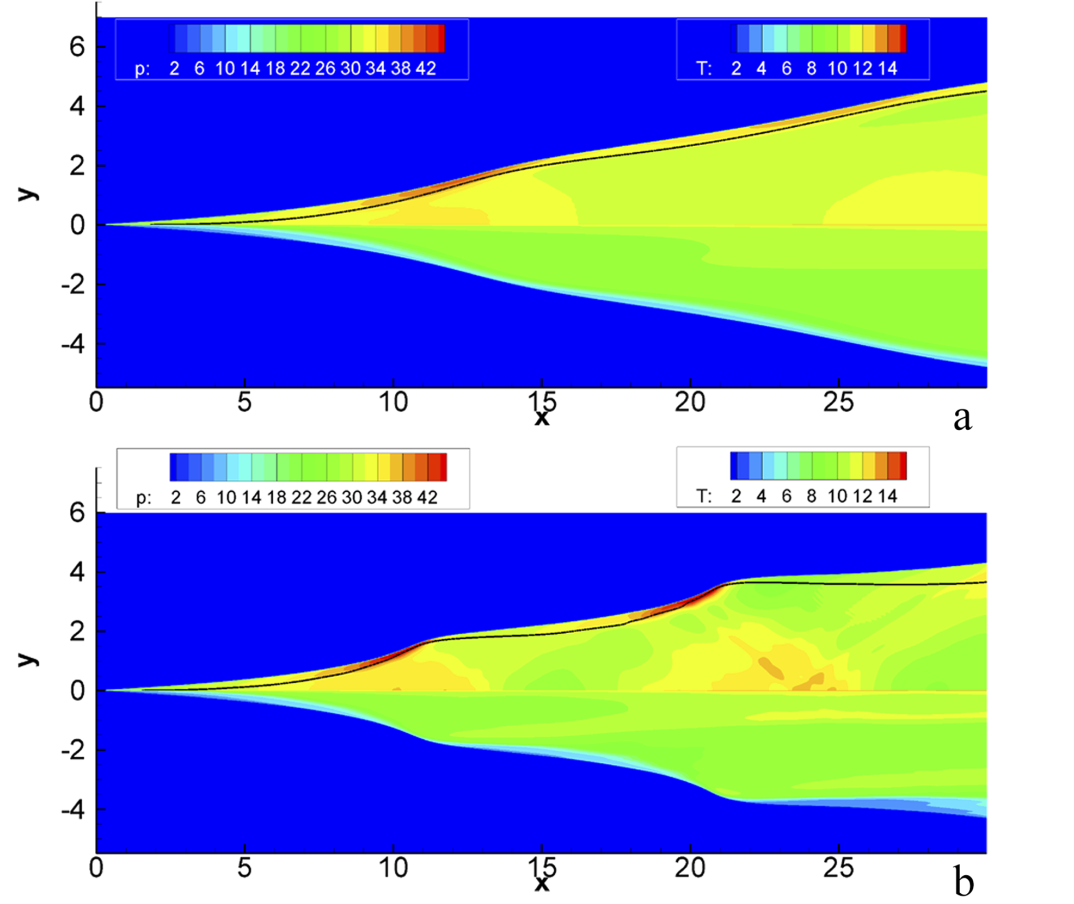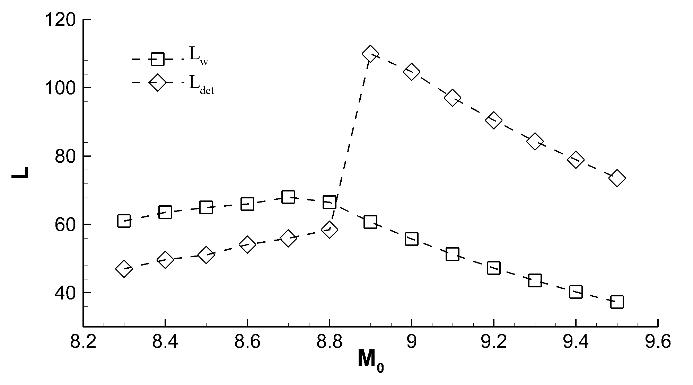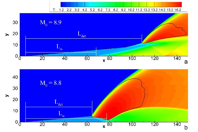 中科院力学所高温气体动力学国家重点实验室激波与爆轰物理与北京理工大学宇航学院合作,开展了斜爆轰波起爆区结构对来流马赫数依赖关系的数值模拟和理论分析。研究发现:来流马赫数低于临界值时,起爆区的流场结构和长度发生突变,并伴随有二次斜爆轰波/斜激波的产生。通过开展稳定性参数的分析以及化学放热反应速率的影响研究,确认了斜爆轰波流场结构的突变主要是爆轰波面变化引起的。更低的来流马赫数条件下,还首次观察到波面位置的无衰减振荡,揭示了斜激波和燃烧耦合系统的内在不稳定性。