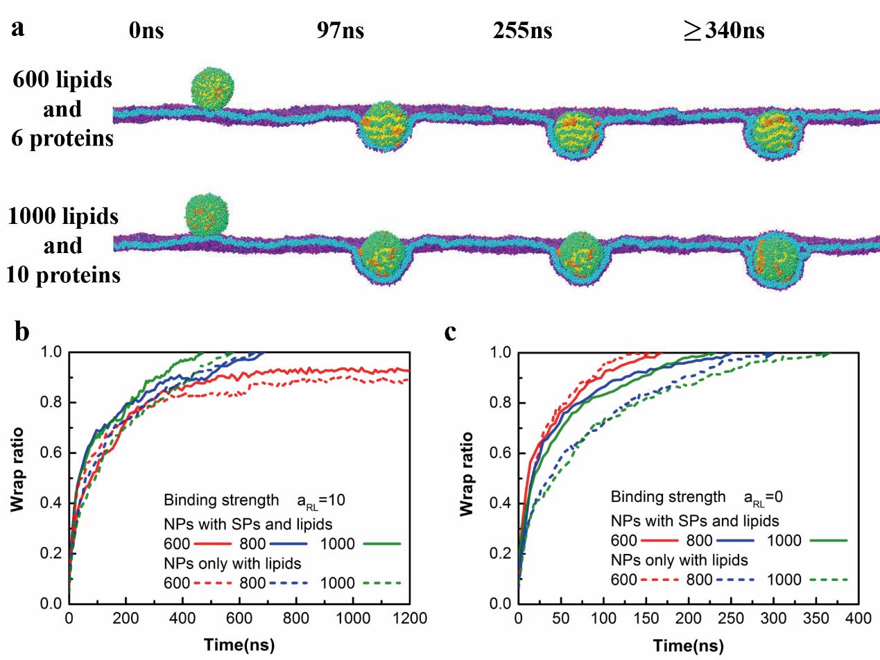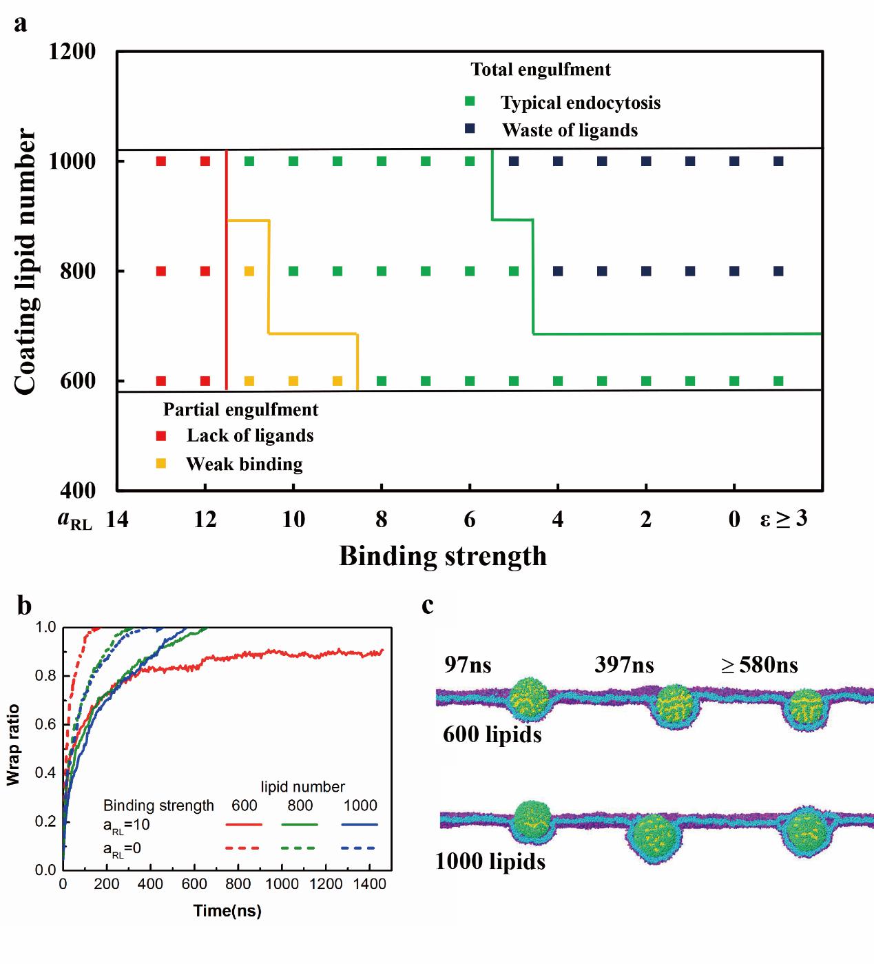 中国科学院力学研究所胡国庆研究团队采用耗散粒子动力学模拟方法,研究了肺表面活性剂修饰的纳米颗粒与细胞膜之间的相互作用。研究表明,肺表面活性剂磷脂和蛋白质分子将改变纳米颗粒的物化特性,影响纳米颗粒与细胞膜的相互作用。其中,颗粒所吸附的磷脂分子可作为被细胞识别的配体,通过受体介导控制颗粒的内吞。在内吞过程中,磷脂会发生明显的形变,使其提供的配体与细胞膜受体更紧密地结合,从而促进内吞完成。所吸附的磷脂分子密度会改变颗粒表面的亲疏水性及配体密度,从而以非特异性和特异性两种作用对纳米颗粒的摄入产生影响。此外,具有疏水特性的表面活性剂蛋白分子通过与细胞膜磷脂的非特异性粘附作用,能够加速细胞膜对纳米颗粒的内吞,但细胞膜的内吞行为主要由肺表面活性剂中占多数成分的磷脂分子所决定。该工作对于评估吸入纳米颗粒的毒性以及设计呼吸给药载体具有重要意义。