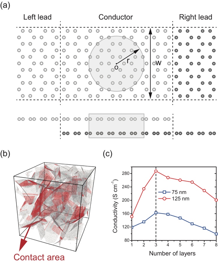 图1.理论框架。(a)第一级:研究石墨烯薄片间的电导。(b)第二级:提取平均接触面积、平均接触点密度等几何特征。 (c) 理论计算结果表明存在电导率极大现象。
