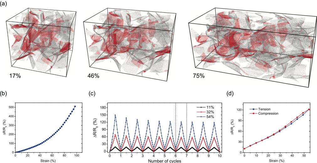 图2. 外载作用下,三维石墨烯泡沫材料的电阻变化规律。(a)不同应变下,三维石墨烯泡沫材料的结构演化。(b)电阻随应变的变化。(c)循环加载下电阻的变化。(d)第七次循环加载下电阻随应变的变化。