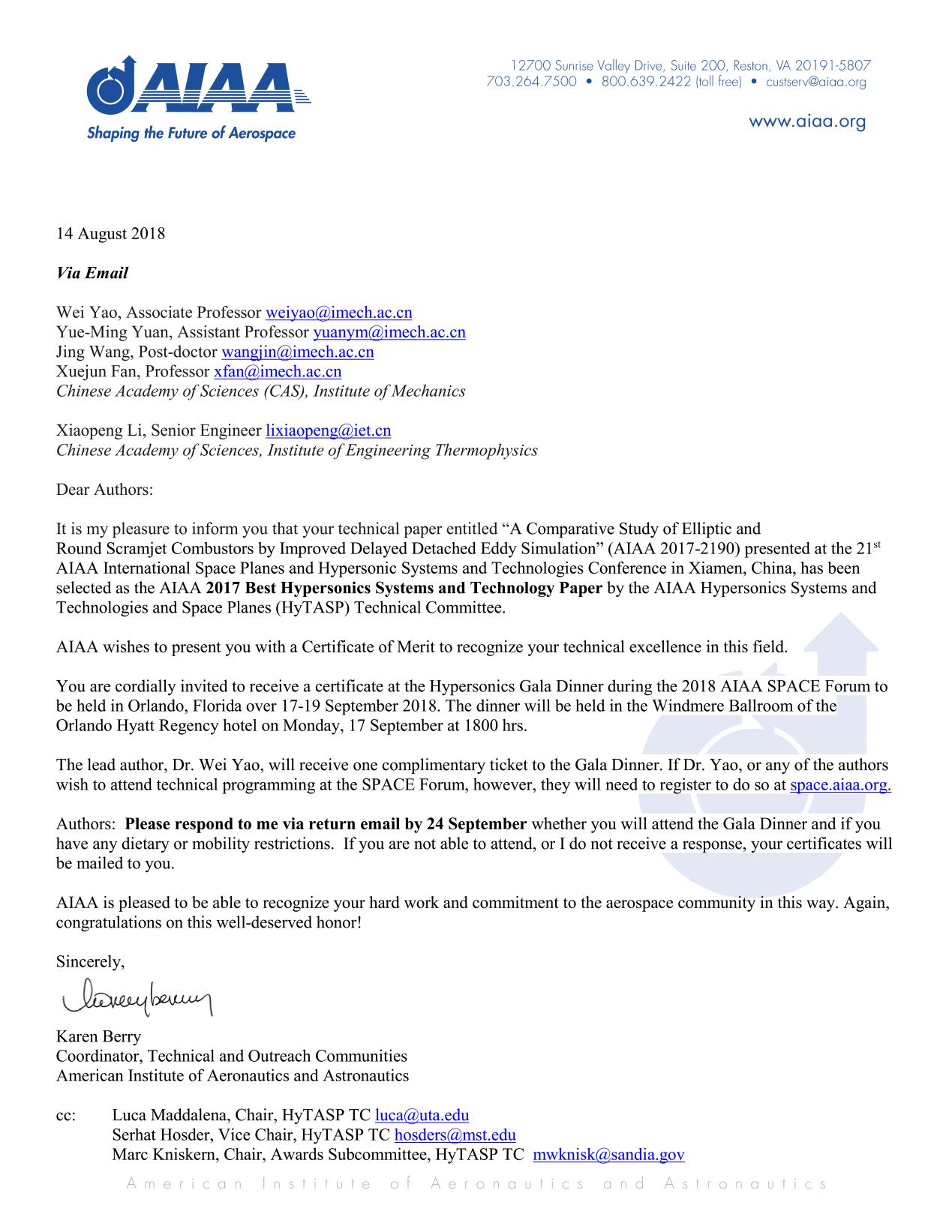 我所姚卫副研究员等获得美国航空航天学会高超声速系统与技术2017最佳论文奖