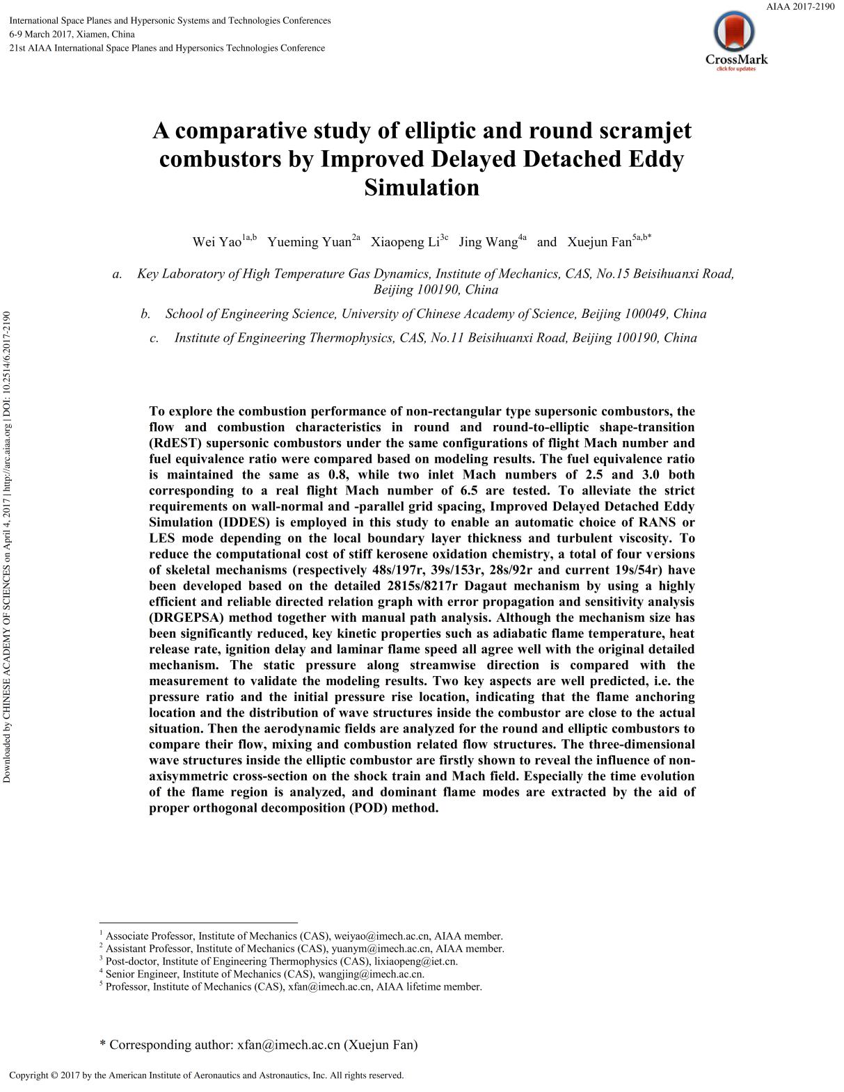近日,力学所高温气体动力学国家实验室姚卫副研究员等撰写的论文“A Comparative Study of Elliptic and Round Scramjet Combustors by Improved Delayed Detached Eddy Simulation (Wei Yao, Yueming Yuan, Xiaopeng Li, Jing Wang, Xuejun Fan, AIAA 2017-2190) ”被美国航空航天学会(AIAA)高超声速系统与技术及空天飞机(Hypersonics Systems and Technologies and Space Planes)技术委员会遴选为2017年度最佳论文,并据此获得高超声速系统与技术最佳论文奖(HYTASP Best Paper Award)。