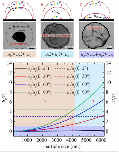 图3 气液界面收缩(A)、重力沉降(B)和毛细补偿流(C)的协同和竞争共同决定沉积图案形貌