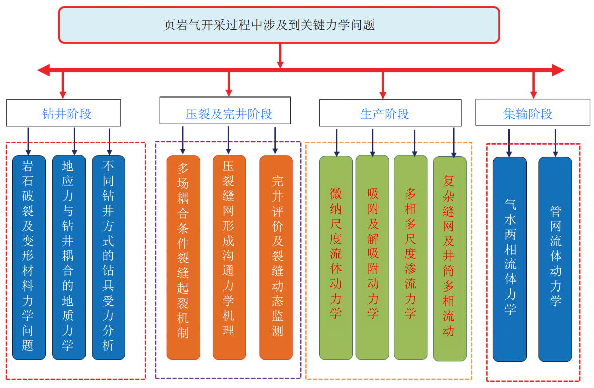 近期,中国科学院力学研究所联合清华大学、中国石油勘探开发研究院历时2年多的时间,针对我国页岩气勘探开发工作所取得的成就及后续发展中面临的前沿力学问题进行了系统综述及深入探讨。针对页岩气直井和水平井开发过程中的不同阶段,分别从页岩气藏的基本特征和开发技术描述、页岩力学性质及其表征方法、页岩气藏实验模拟技术、页岩气微观流动机制及流固耦合特征、水力压裂过程数值模拟方法、水力压裂过程微地震监测技术、高效环保的无水压裂技术等7个方面对页岩气开采中的若干力学前沿问题进行了总结和展望(如图1所示),并且结合页岩气藏开发的工程实践,深入探究页岩气开采过程中的力学关键问题发展趋势。