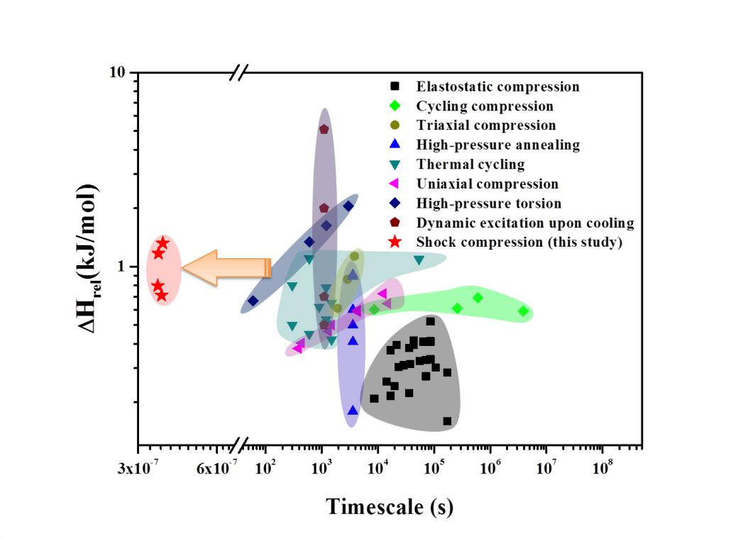 亚稳态的玻璃材料具有向热力学平衡态的自发老化(aging)趋势,同时伴随着材料性能的劣化。但是,通过外部能量输入,老化的玻璃物质能够重新实现结构的年轻化(rejuvenation)。这一反老化(anti-aging)过程一方面有助于对玻璃复杂动力学行为的基本理解,另一方面也有利于玻璃材料的工程应用。近年来,针对具有广泛应用前景的金属玻璃材料,一系列基于非仿射变形的结构年轻化方法被提出,以期对材料的力学、物理性能进行有效调控。但是,之前所有的年轻化方法都工作在较低应力水平且需要足够长的时间尺度,因此,具有很大的局限性。