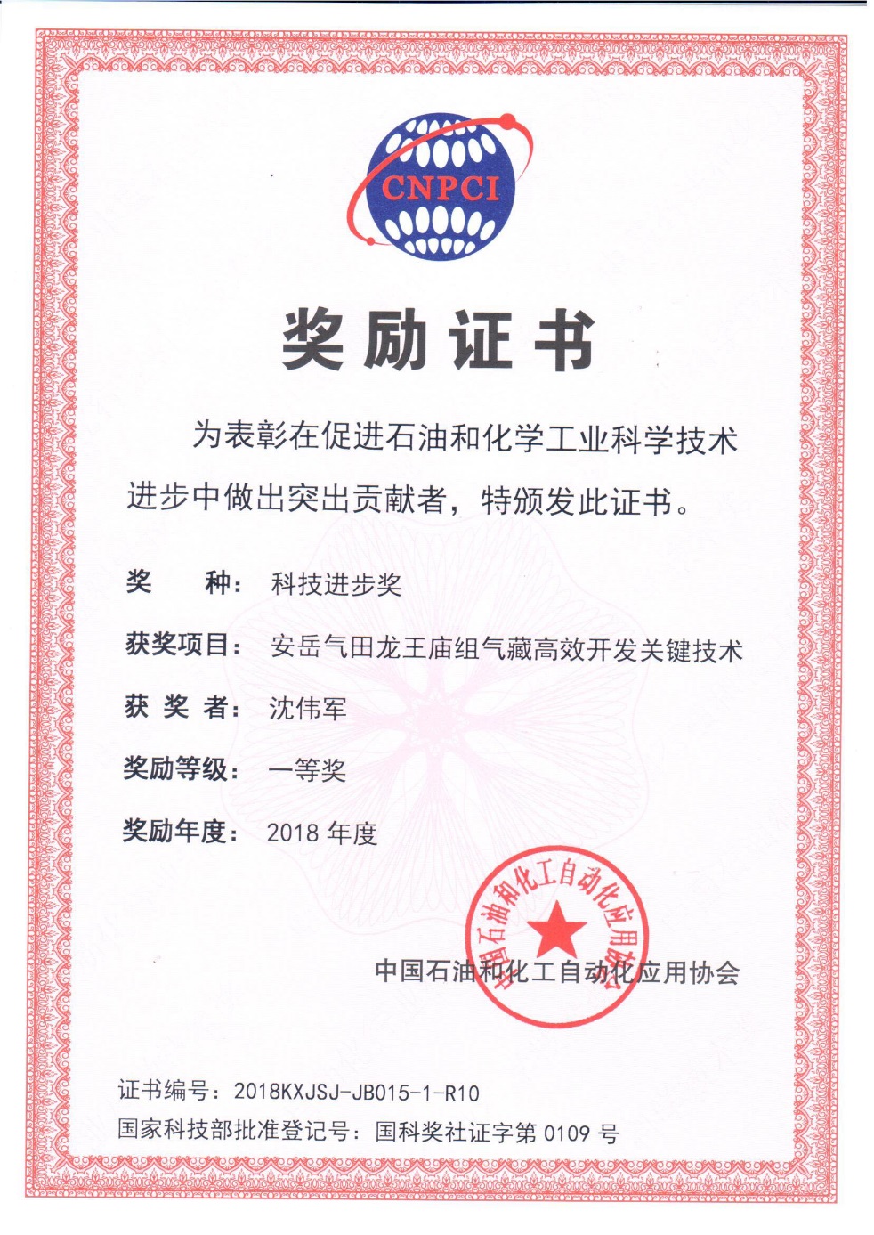 “安岳气田龙王庙组气藏高效开发关键技术”获得中国石油和化工自动化应用协会科技进步一等奖