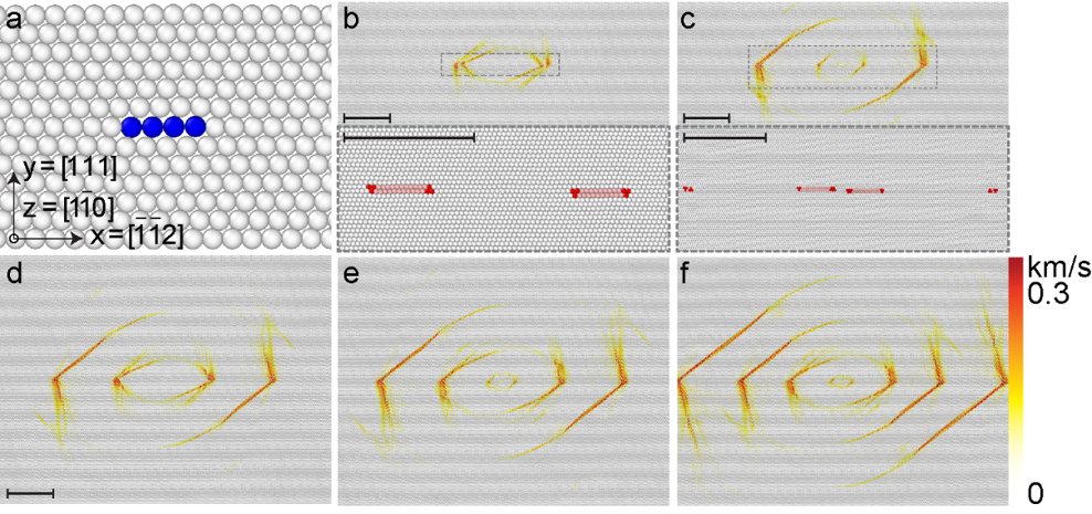 图:纳米析出相诱导的位错源机制:(a) 析出相(蓝色)所代表的原子结构示意图. (b)-(f) 原子速度场显示在定常临界应变控制下,位错从析出相和基底界面上不断萌生的过程。通过图(b) 和(c)中下方的方框区域放大图,可以看到螺位错的基本原子结构。图中所给出的标尺为8 nm