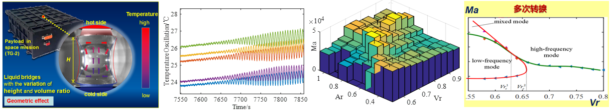 该实验探明了液桥热毛细对流振荡的临界Marangoni数范围,刻画了几何参数效应(涵盖体积比和高径比)的完整起振图谱,首次观测到垂直跳变型失稳新效应;发现了热毛细对流多次转捩新机制;首次提出了独特的低频起振失稳区域新概念,对临界失稳条件有了全新的认知;得到不同几何参数下行波与驻波的多模式转换图谱;发现了微重力下更为丰富的、复杂的耦合分岔途径。(J. Fluid Mech., 2019; Phys. Fluids, 2020; Featured Article; Int. J Heat Mass Trans., 2017)