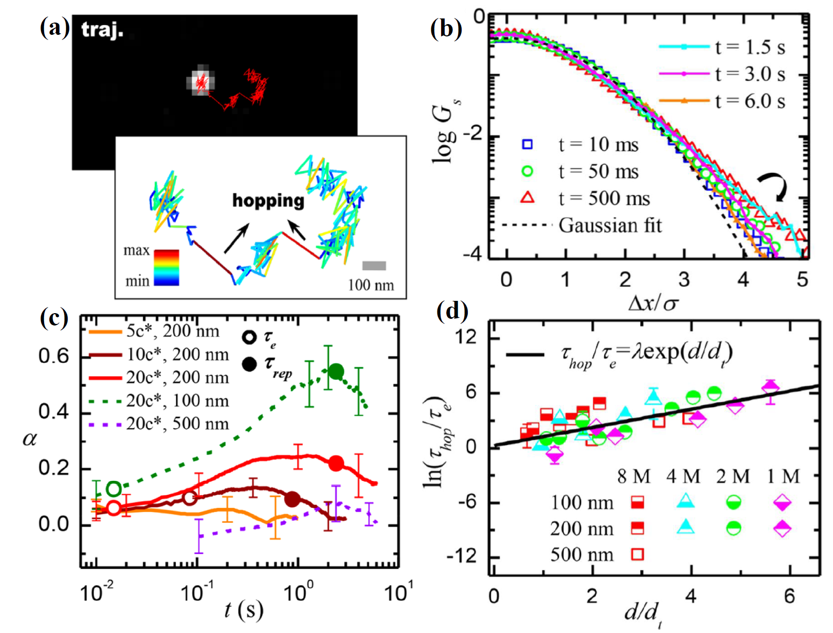 纳米颗粒在高聚物、生物粘液等复杂流体中的扩散运动有重要的应用背景,被认为是药物输运的关键物理机制之一。高聚物等复杂流体具有微观非均匀结构,会导致纳米颗粒扩散运动出现反常特征。以往研究认为,对于稀释高聚物溶液(dilute polymer solution),纳米颗粒的扩散主要受限于高聚物形成的网络尺寸,当纳米颗粒直径小于网格尺寸时,会发生穿透高聚物网络的跳跃行为,被称为跳跃扩散(hopping diffusion)。这种长位移的跳跃行为,可能会在比较拥挤的微环境中发挥强化输运的作用。随着高聚物浓度上升,其溶液中网络尺寸减小,现有理论认为在纠结高聚物溶液(entangled polymer solution)中纳米颗粒的跳跃扩散不再会发生。