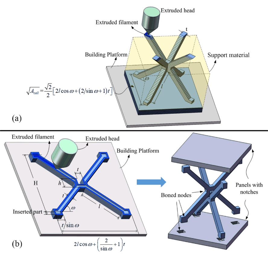 轻质点阵结构在承载、吸能、隔热、隔震等诸多领域有着重要的应用前景,传统的制备方法如冲压成型、熔模铸造等对点阵结构的材料选择、杆件尺寸和构型选择都有诸多的要求,从而制约了其进一步的工程应用。近年来,随着3D打印技术的快速发展,这种高效、灵活的技术开始被越来越多的应用于点阵结构的制备。然而,目前广泛采用的一体化打印的点阵结构往往存在着严重的各向异性和支撑材料去除的问题,前者使得3D打印点阵结构的力学性能远小于理论值,后者则显著增加了后处理的时间与成本。