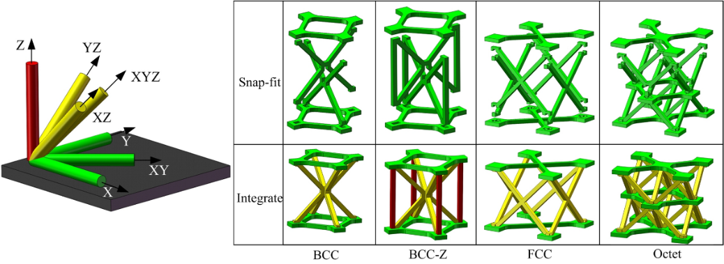 进一步将该方法拓展到聚合物喷射成型(PolyJet)技术中,制备了BCC、BCC-Z、FCC、Octet四类典型的点阵结构,实现了不同构型的PolyJet点阵结构中杆件的最佳打印方向(X-Y平面)。