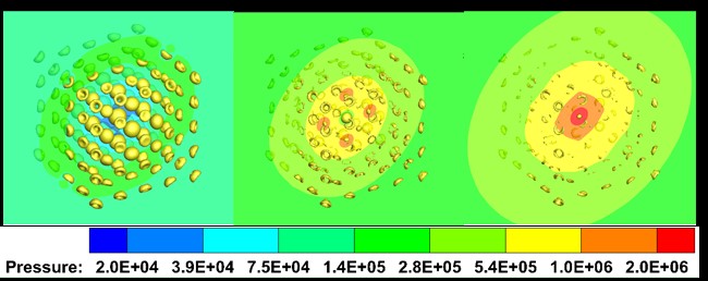 其次是细观结构对溃灭的影响机制。与当前最常用的Singhal模型进行对比,当前模型能够准确地刻画出由气泡数密度分布不均匀导致的局部高压。基于气泡群的模型获得的溃灭压力,与直接模拟获得的气泡群加速溃灭的特征一致。