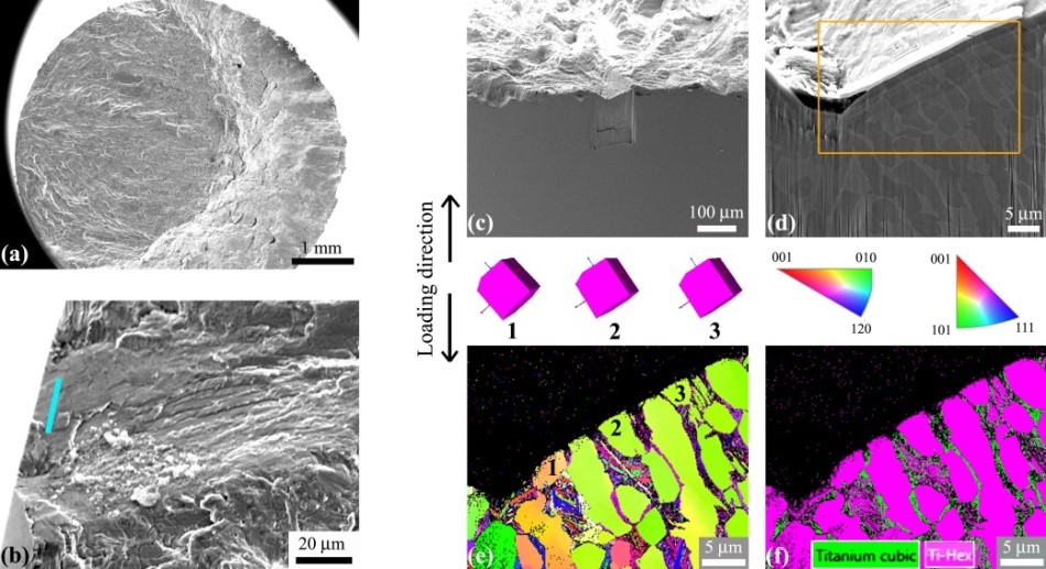 图1 (a)和(b):具有“小平面”特征的疲劳断口扫描电镜照片,σmax=693 MPa, Nf=3.27×105;(c)和(d):“小平面”区域(图(b)中蓝线位置)沿主应力抛面的扫描电镜照片;(e)和(f):图(d)中方框区域电子背散射衍射观测结果