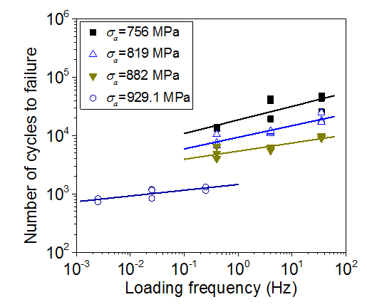 图2 Ti62A疲劳寿命随加载频率的变化关系,线条为双对数坐标下的线性回归结果