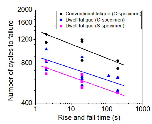 图3 疲劳寿命随升载/降载时间的变化,线条为双对数坐标下的线性回归结果中(C-specimen:圆形截面试样;S-specimen:方形截面试样)