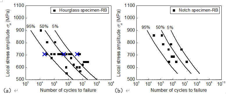 图4 轴向加载下沙漏形试样疲劳实验数据对旋转弯曲加载下沙漏形试样和缺口试样预测的P-S-N曲线与实验结果的比较,“×”为σa=706.2 MPa下17个实验数据点统计分析获得5%、50%和95%存活率的疲劳寿命
