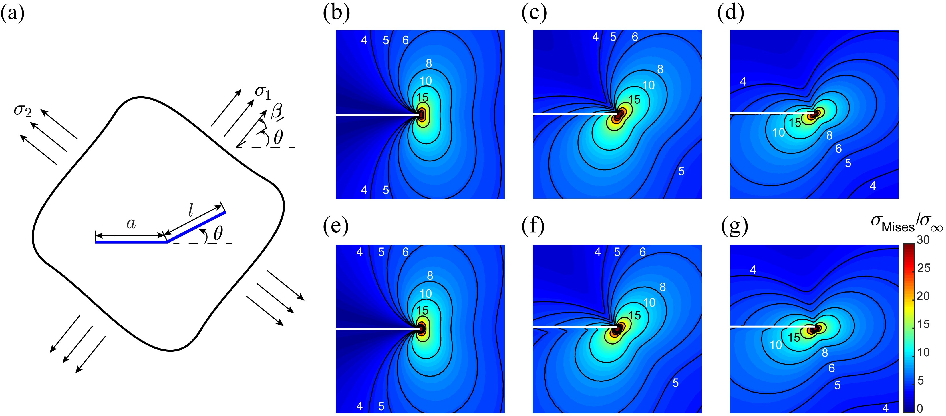 图:二维裂纹偏折问题的几何及加载参数以及单轴加载下不同转折角θ对应的裂纹尖端应力场