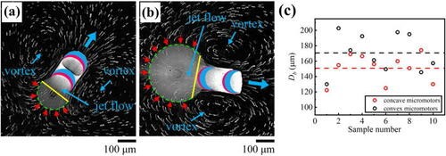 不同于以往研究局限于规则球型微马达,研究团队通过自研的微流控芯片技术制备了具有不同凹/凸曲面的碗状微马达。通过镀层位置控制微气泡分别生成于凹面或者凸面,可以相应的实现微马达朝凸面或凹面驱动。研究首先揭示了曲面曲率对微气泡成核及生长过程的影响,发现凹面抑制气泡形成导致较小的微气泡尺寸及较慢的气泡生长周期。进而通过引入Kelvin冲量来描述气泡溃灭形成的射流对微马达的驱动作用。由于射流对应的Re数可达到10,不能简单的基于低Re数Stokes流理论忽略微马达形状的影响。综合上述因素,发现并解释了从凸面生长气泡并朝凹面运动的微马达具有更高的速度。研究结果为通过形状调控微马达驱动机制及微气泡动力学行为提供了理论基础,并为微机器人应用中采用非常规形状微马达提供了新的思路。