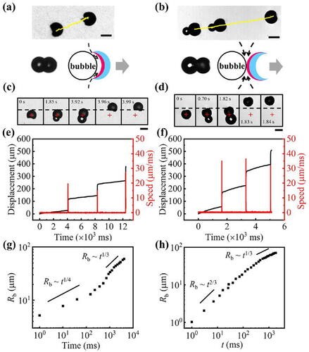 图3 凹马达(左列)和凸马达(右列)相应的实验图像、驱动速度及气泡生长标度率
