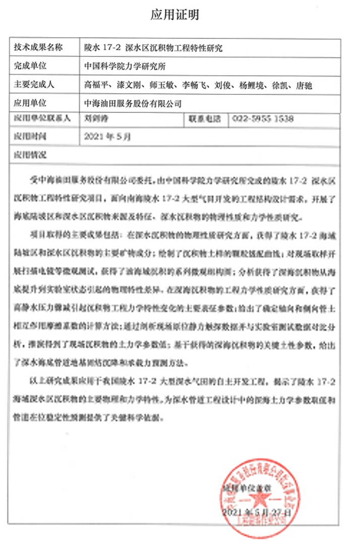 研究成果应用于我国陵水17-2大型深水气田的自主开发工程,为深水管道工程设计中的深海土力学参数取值和长输管道失稳预测提供了科学依据。部分成果发表于《海洋工程》(2021年39卷6期)、Journal of Marine Science and Engieering (2021, Vol. 9(8))、Proceedings of the Fourteenth ISOPE Pacific-Asia Offshore Mechanics Symposium。该研究工作获得国家杰出青年科学基金项目(11825205)、中海油田服务股份有限公司技术服务项目、中国科学院战略性先导科技专项(B类)(XDB22030202)的资助。