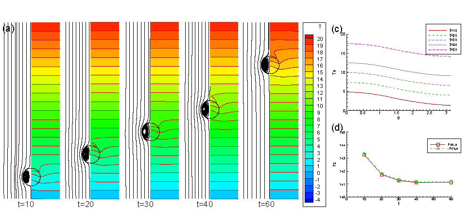 图:随时间和热辐射数变化的液滴内外流场、温度场、界面温度分布和总的表面张力。
