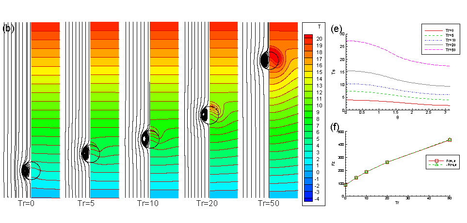 近期,非线性力学国家重点实验室(LNM)“微纳流体力学”课题组的武作兵研究员,基于液滴表面吸热原理在采用热辐射技术操控液滴热毛细迁移研究中取得进展。在均匀和非均匀辐射热流的作用下,首先给出了液滴热毛细迁移的理论分析解;其次,借助于数值模拟方法确定了液滴迁移的动力学过程、定态迁移速度、内外温度场拓扑结构、界面温度以及总的表面张力随Marangoni数、热辐射数和体积热容比有明显的变化规律(如图所示),并分析了其内在的物理机制。该方法的主要优点在于非接触操控液滴热毛细迁移,对于在微流体和微重力流体力学领域的实际应用具有重要意义。