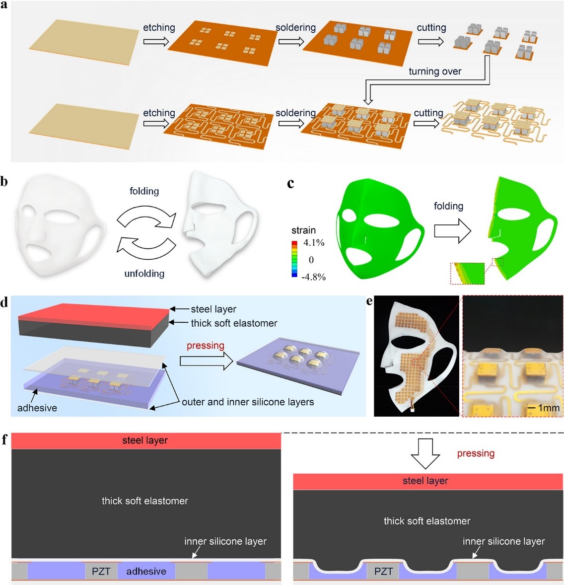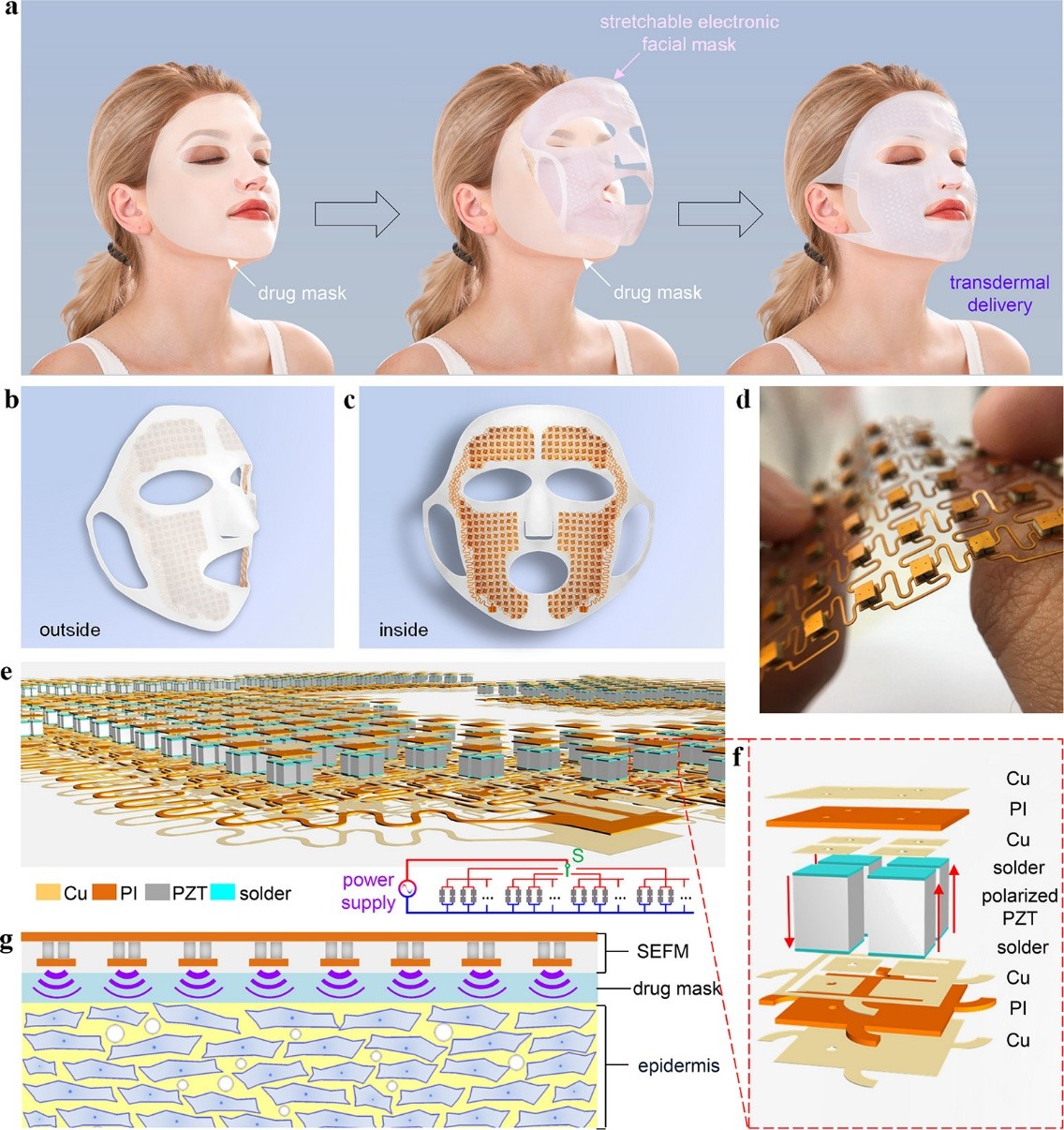 改善面部健康状况对所有年龄段的人都具有重要意义,因此设计出一种可穿戴柔性电子器件将超声促渗技术应用于面部健康护理是一个很有吸引力的想法。近年来,研究者已经设计和制备了一系列的大变形柔性超声器件,这些器件在医疗健康领域有着巨大的应用潜力,其中的大多数用于贴合复杂表面来监测或成像内部结构,比如复杂内部缺陷的三维图像,中心动脉血压,深层组织血液动力学,血流速度,等等。此外,这类超声器件的主动治疗能力最近也开始被人们研究,比如有研究者开发了一种柔性超声治疗贴,用于加速慢性伤口愈合。然而,目前尚未发现有研究将其应用于经皮给药或将其应用于具有大面积、复杂表面的整个人脸。