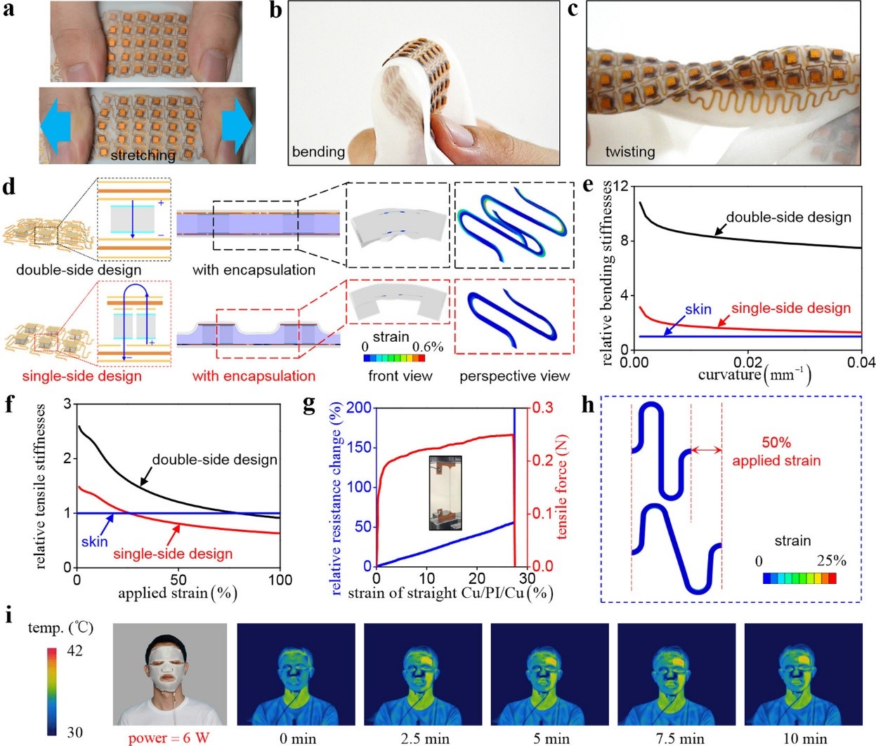 图3. SEFM的力学与热学性能(a)拉伸;(b)弯曲;(c)扭转;(d)单侧设计与双侧设计的比较以及两种设计下受到弯曲曲率为0.022 mm-1时的应变分布;(e)相对于人体皮肤的弯曲刚度随弯曲曲率的变化曲线;(f)相对人体皮肤的拉伸刚度随施加应变的变化曲线;(g)直长条形Cu/PI/Cu复合结构(厚度为18/100/18 μm)的拉力与相对电阻变化随施加应变的变化曲线;(h)Cu/PI/Cu复合结构蛇形互连导线的单轴拉伸到50%施加应变时的应变分布;(i)在30°C的环境温度下,输入6 W电功率时,SEFM佩戴在面部且其一半区域工作时的温度分布