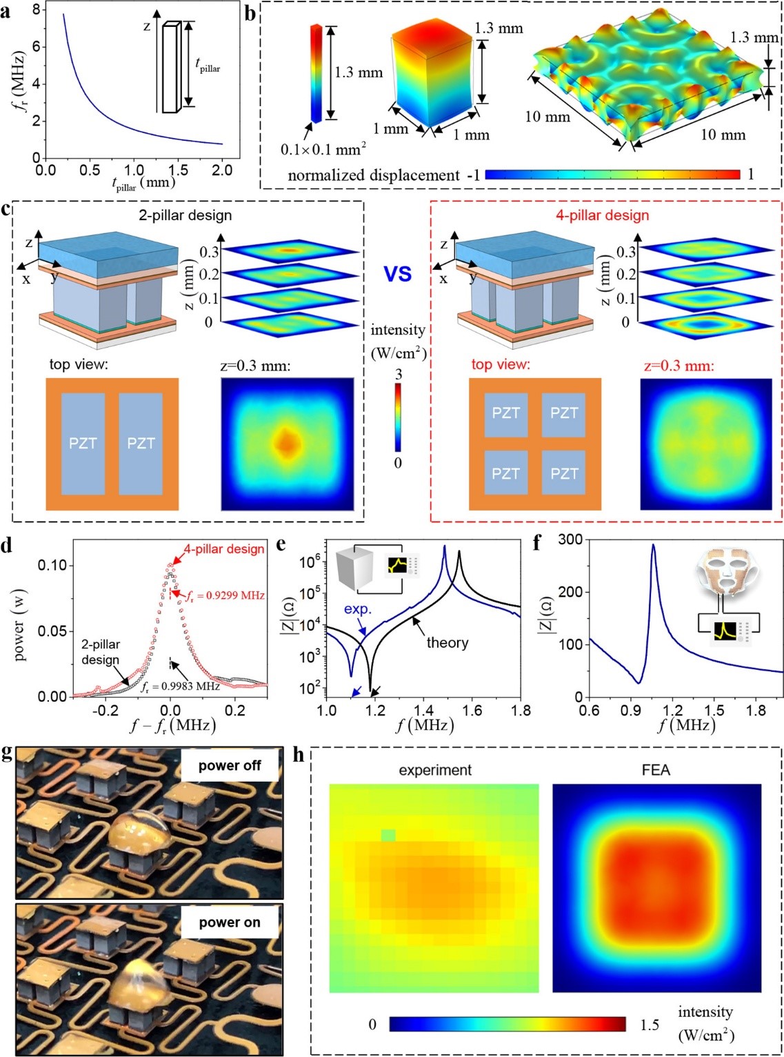 图4. 压电元件的设计与性能(a)通过一维压电理论模型得到了压电柱的谐振频率与长度之间的关系;(b)不同横截面积压电柱振动模式的比较;(c)两柱和四柱设计的声强分布比较;(d)两柱和四柱设计之间声场总功率的比较;(e)单个压电柱的阻抗-频率曲线;(f)最终封装后SEFM的四分之一区域的阻抗频率曲线;(g)间接证明SEFM向水滴发射超声波的视觉效果;(h)FEA和实验的声场分布比较
