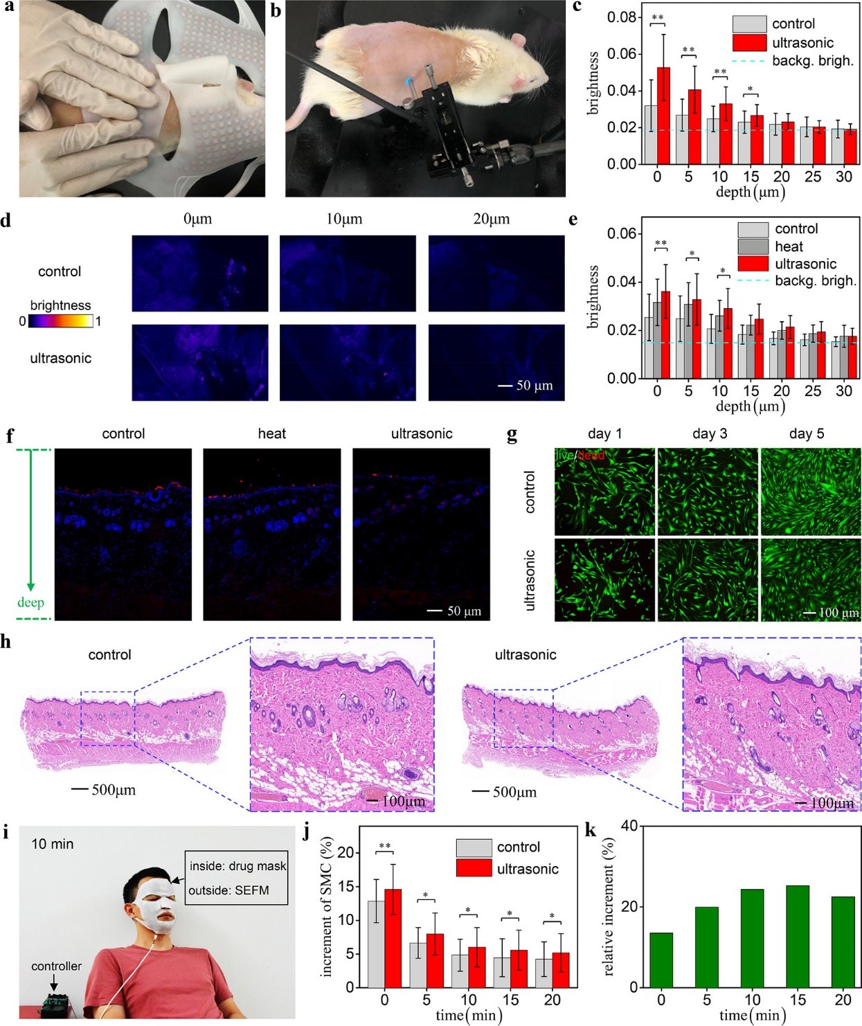 图5. HA经皮导入实验(a)SEFM对Sprague-Dawley大鼠的HA经皮导入;(b)不同皮肤深度下罗丹明标记HA的测量;(c)对照组和超声组在不同皮肤深度下的荧光亮度比较;(d)伪彩色处理后对照组和超声组在不同皮肤深度下的典型共聚焦显微照片;(e)对照组、加热组和超声组在不同皮肤深度下的荧光亮度比较;(f)对照组、加热组和超声组的组织切片比较,直观展示导入深度;(g)人真皮成纤维细胞与SEFM共培养的活/死染色结果;(h)对照组和超声组的组织切片比较,展示皮肤完整性;(i)利用SEFM在面部的HA经皮导入;(j)对照组和超声组皮肤含水量增量随时间变化的比较;(k)超声组和对照组之间皮肤含水量平均值的相对增量