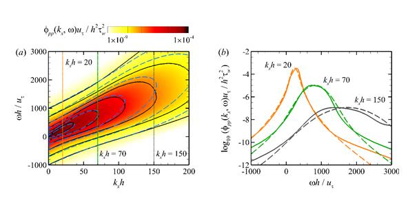图1. 壁面压力时空谱的DNS结果(实线)与随机下扫模型(虚线)的对比:(a)流向波数-频率时空谱;(b)流向波数为 的截面对比