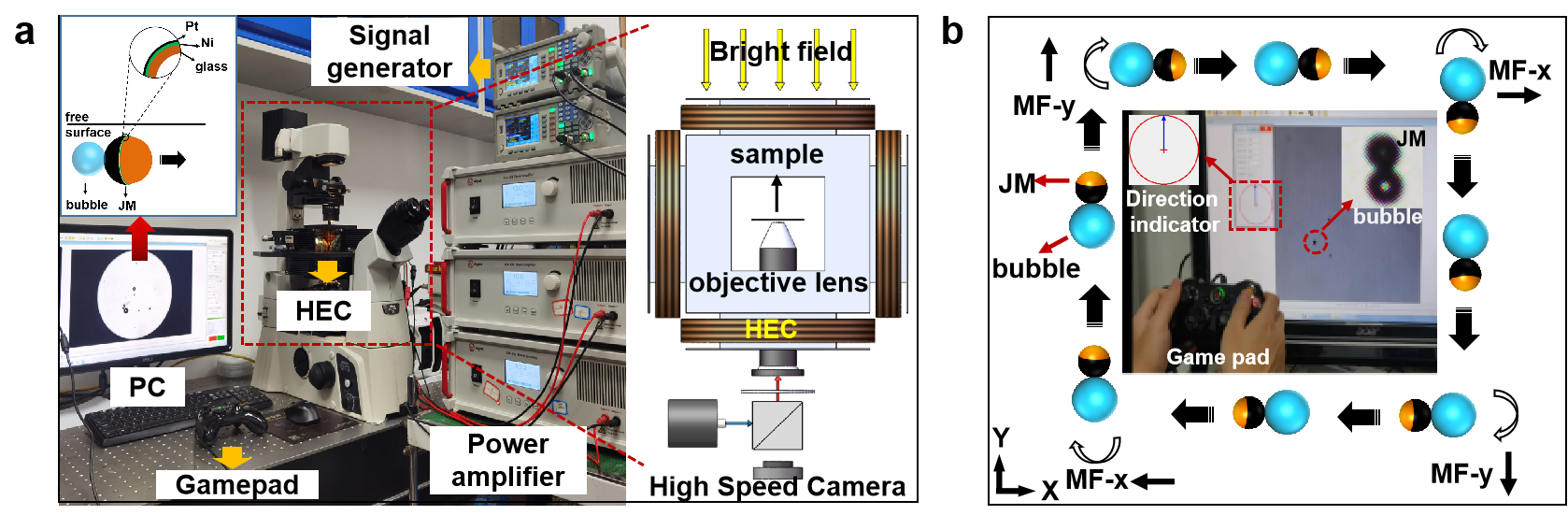 图1. 基于三维Helmholtz磁控系统采用手柄即可对气泡微机器人进行灵魂操控