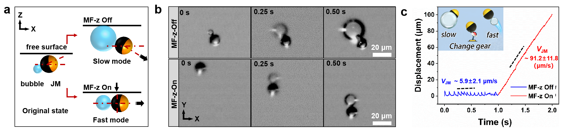 图2. 通过磁场调整液气界面附近Janus微球的朝向以实现气泡微机器人的远程速度调制