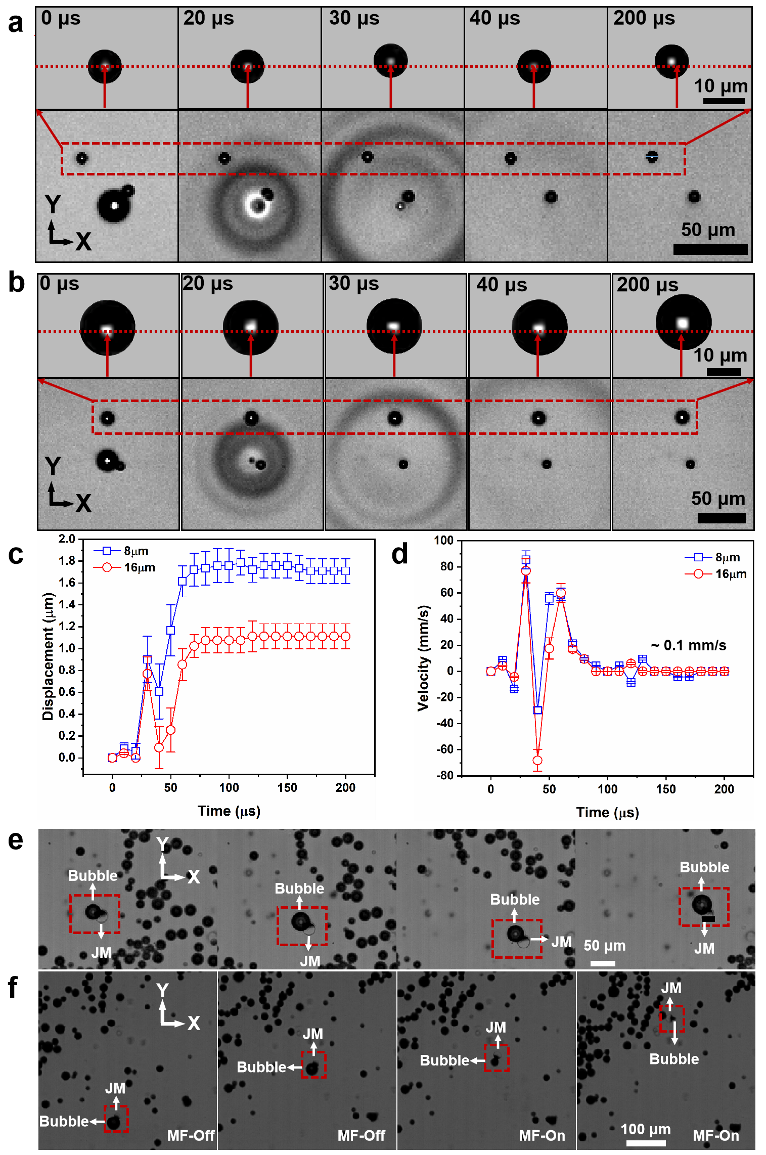 中科院力学所非线性力学国家重点实验室微纳流动研究团队发展了新型磁控多工作模式的气泡微机器人。搭建了三维Helmholtz线圈磁控系统,可对内嵌磁性镍层的Janus微球的朝向及运动通过手柄或程序进行便捷且高效的操控(图1)。本研究首次提出通过磁场调整液气界面附近Janus微球的朝向,即可实现气泡微机器人的远程速度调制(图2)。通过实验揭示了微气泡溃灭引起射流的流动特征,并通过调整Janus微球、微气泡、目标物的相对位置,利用射流流动实现了对目标推进、锚定、抓取等不同功能(图3)。微气泡在液气界面附近溃灭还会产生表面毛细波,可对远场颗粒进行大范围清扫(图4),且表面波远场功能与与射流近场功能可进行可控切换。