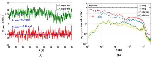 在激光捕获探测技术方面,首次提出并采用了改进的质心算法,在百皮瓦级弱光情况下实现了亚像素级光斑中心定位精度。在QPD前设计了共轭成像系统,降低了beam-walk对DWS技术非线性误差产生的影响,提高了精密指向阶段角度测量精度。在QPD探测器处,激光捕获及激光精密指向结果如图3所示,对应到实际400倍放大率的望远镜前均能满足太极计划要求,充分验证了目前拟采用方案的可行性。
