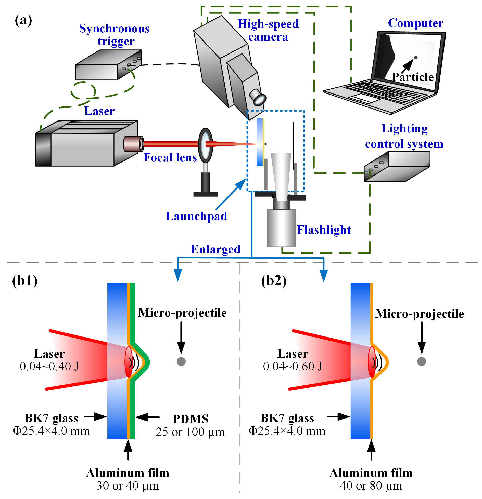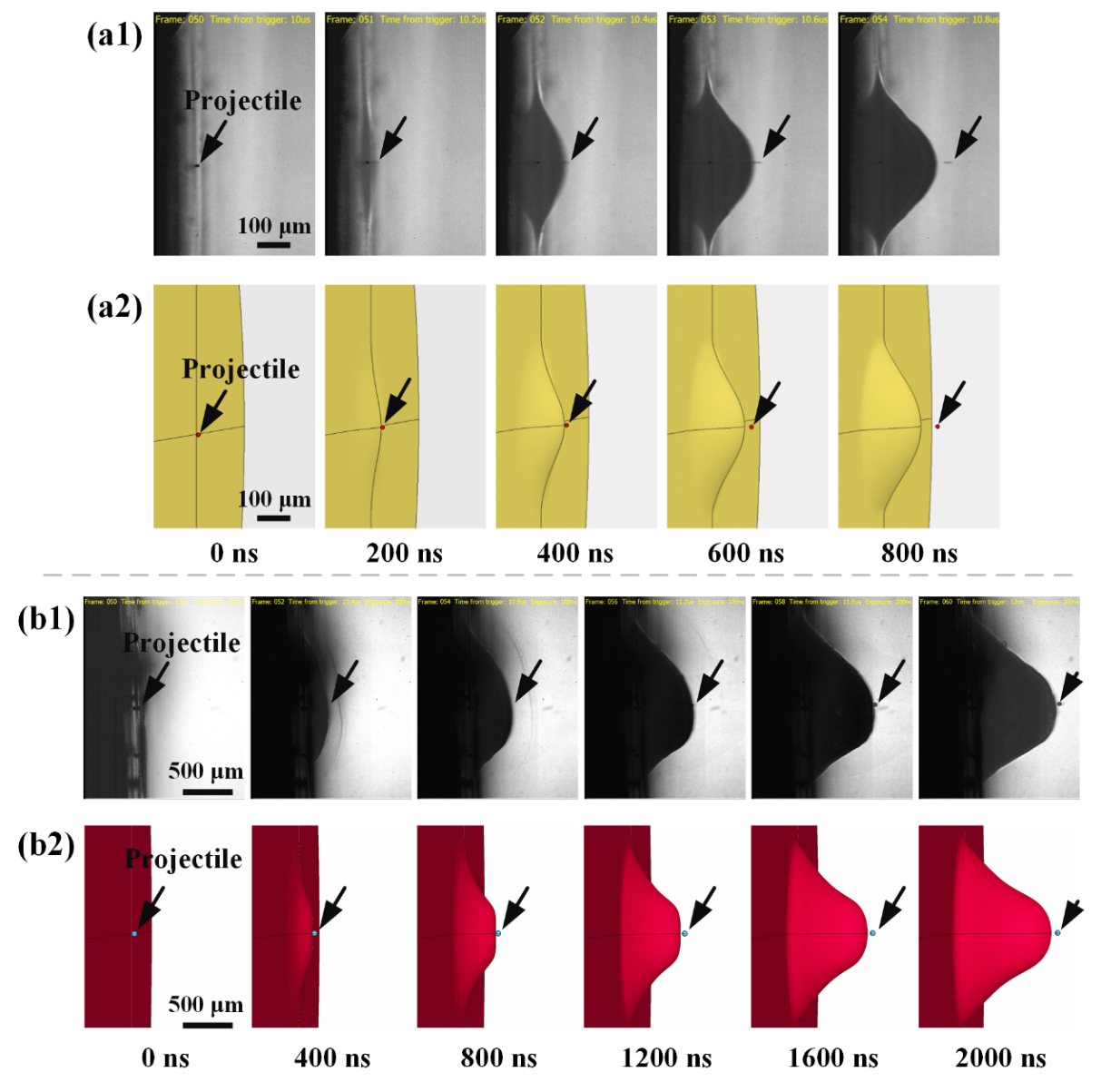 发展先进的加载与测量手段,展现材料独特的动态力学行为,一直是冲击动力学研究的主题。近年来,高性能纤维、薄膜等基础材料在冲击防护领域得到大量应用。但是传统的爆炸与冲击加载方法由于尺度较大、测量精度有限,难以表征纳米或微米尺度纤维及薄膜材料的冲击动力学行为,需要发展新的微纳尺度冲击动力学实验手段。前期,我们利用强激光驱动爆炸与冲击效应,建立了强激光驱动微弹道冲击实验平台(子弹直径~10μm,速度~700m/s),并获得了nm~μm厚度碳纳米管薄膜、非晶合金薄膜等材料的冲击防护性能与耗能机制(Extreme Mech Lett 2021; Carbon 2021; Nano Mater Sci 2021)。但是,由于强激光驱动微弹道冲击涉及强激光吸收-等离子体演化-薄膜介质动态变形-微子弹冲击,物理过程较复杂,目前对于强激光驱动微弹道冲击的作用机理与相似规律尚不清楚。需要发展耦合物理模型,分析驱动过程的主控参数,来建立强激光驱动微弹道冲击的相似律,并进一步提升微子弹的侵彻速度,拓展其应用范围。