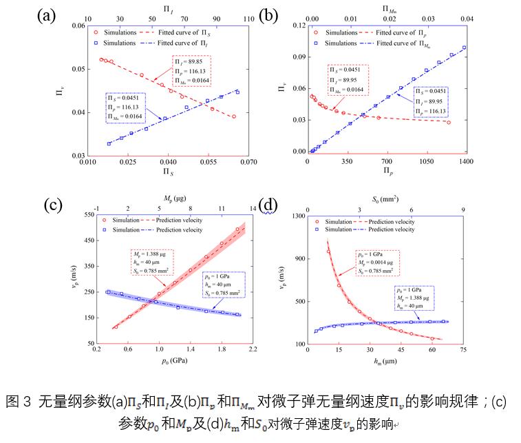 为此,中科院力学所流固耦合系统力学重点实验室吴先前副研究员考虑强激光的反射与非线性吸收、等离子体逆轫致吸收、薄膜材料中应力波传播与衰减等效应,建立了强激光吸收-等离子体演化-薄膜介质动态变形-微子弹变形与运动的耦合物理模型,并发展了相应计算方法,能够对不同参数条件下的微子弹驱动过程进行较准确描述;与此同时,针对不同的时间尺度,将强激光驱动微弹道冲击过程解耦为强激光诱导等离子体冲击波(时间尺度ns量级)及冲击波诱导薄膜变形、微子弹运动(时间尺度μs量级)两个物理过程,采用分步量纲分析方法,得到了影响微弹道侵彻速度的主控无量纲参数,提出并验证了强激光驱动微弹道冲击相似律;结合耦合数值模拟和实验验证,拟合得到了强激光驱动微弹道侵彻速度的经验计算公式,并给出了更高侵彻速度的实验参数条件。为强激光驱动微弹道侵彻速度预测和实验方法改进提供了分析方法。