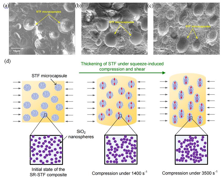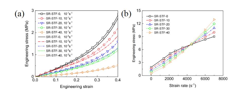 为此,中科院力学所流固耦合系统力学重点实验室吴先前副研究员提出STF微胶囊-聚合物基体复合材料设计思想,一方面解决STF的工程应用难题;另一方面通过STF的液-固相变、大量STF/基体界面阻抗不匹配效应以及STF与基体的耦合增强耗散效应,进一步提升材料的冲击防护性能。通过与中国工程物理研究院化工材料研究所合作,成功制备了STF微胶囊-硅橡胶基体(SR-STF)复合材料。研究发现SR-STF复合材料在低应变率下表现出良好的柔韧性,但在高应变率下由于压缩及剪切诱导的增稠效应,导致材料表现出较高的刚度,具有显著的应变率敏感性;且随着STF微胶囊质量分数的增加,SR-STF复合材料在低应变率下的柔韧性和高应变率下的刚度都迅速提高,具有更强的应变率强化效应,体现出对不同冲击载荷的智能自适应性。基于实验结果,建立了包含STF微胶囊质量分数、应变硬化及应变率强化效应的粘弹性本构模型,能够较准确地描述SR-STF复合材料的力学行为。研究工作为STF在柔性冲击防护领域的应用提供了新的设计理念和方案。