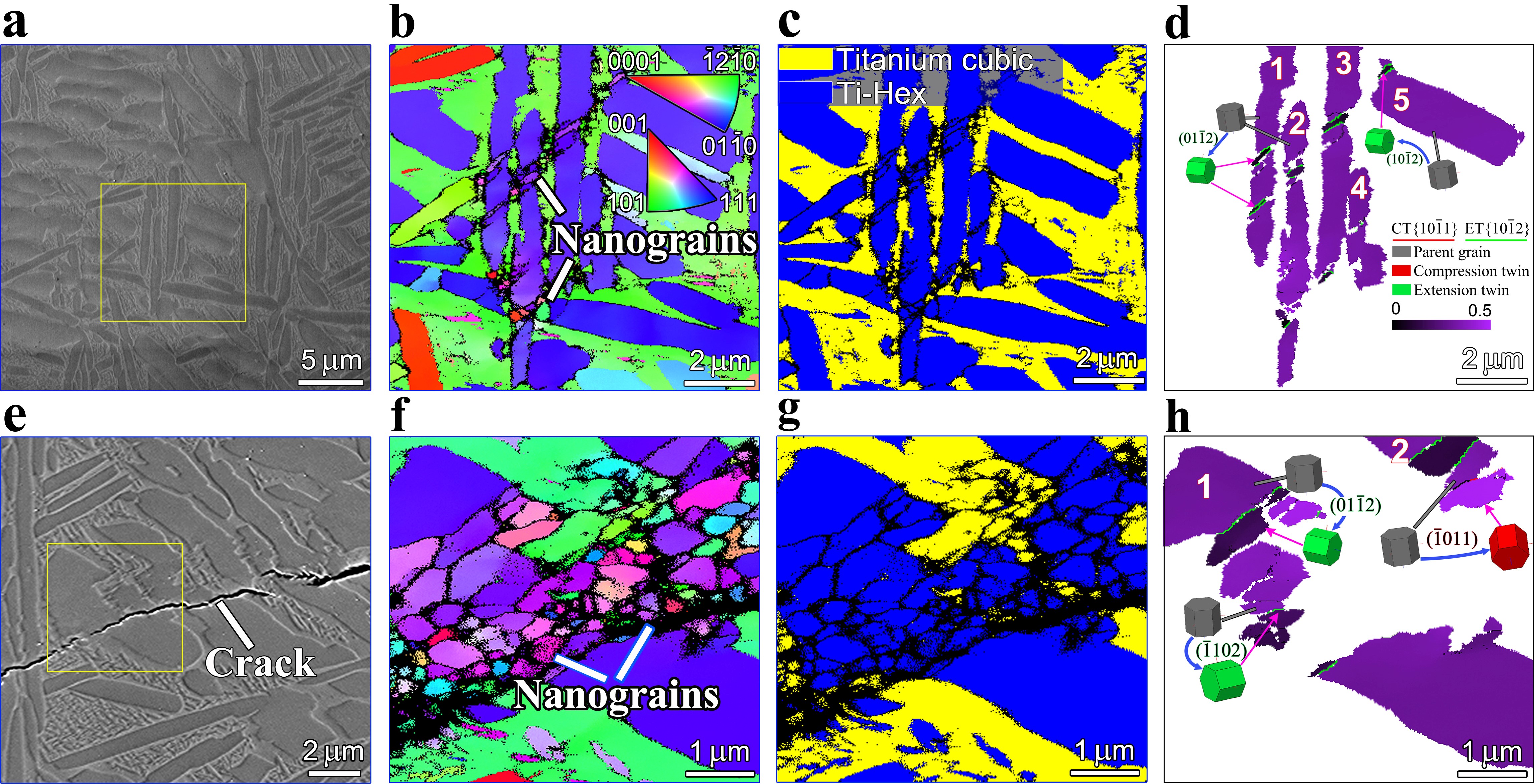 图1 TC17钛合金扫描电子显微镜和电子背散射衍射观测结果(σα=588 MPa, R=–1, Nf=1.4×108 cyc). a: 试样局部区域扫描电子显微镜图像. b-d: 分别是图a中方框区域的反极图、相图以及母体晶粒和孪晶变体基面的施密特因子. e: 微裂纹附近扫描电子显微镜图像. f-h: 分别是图e中方框区域的反极图、相图以及母体晶粒和孪晶变体基面的施密特因子. 加载方向沿着纸面向上和向下.