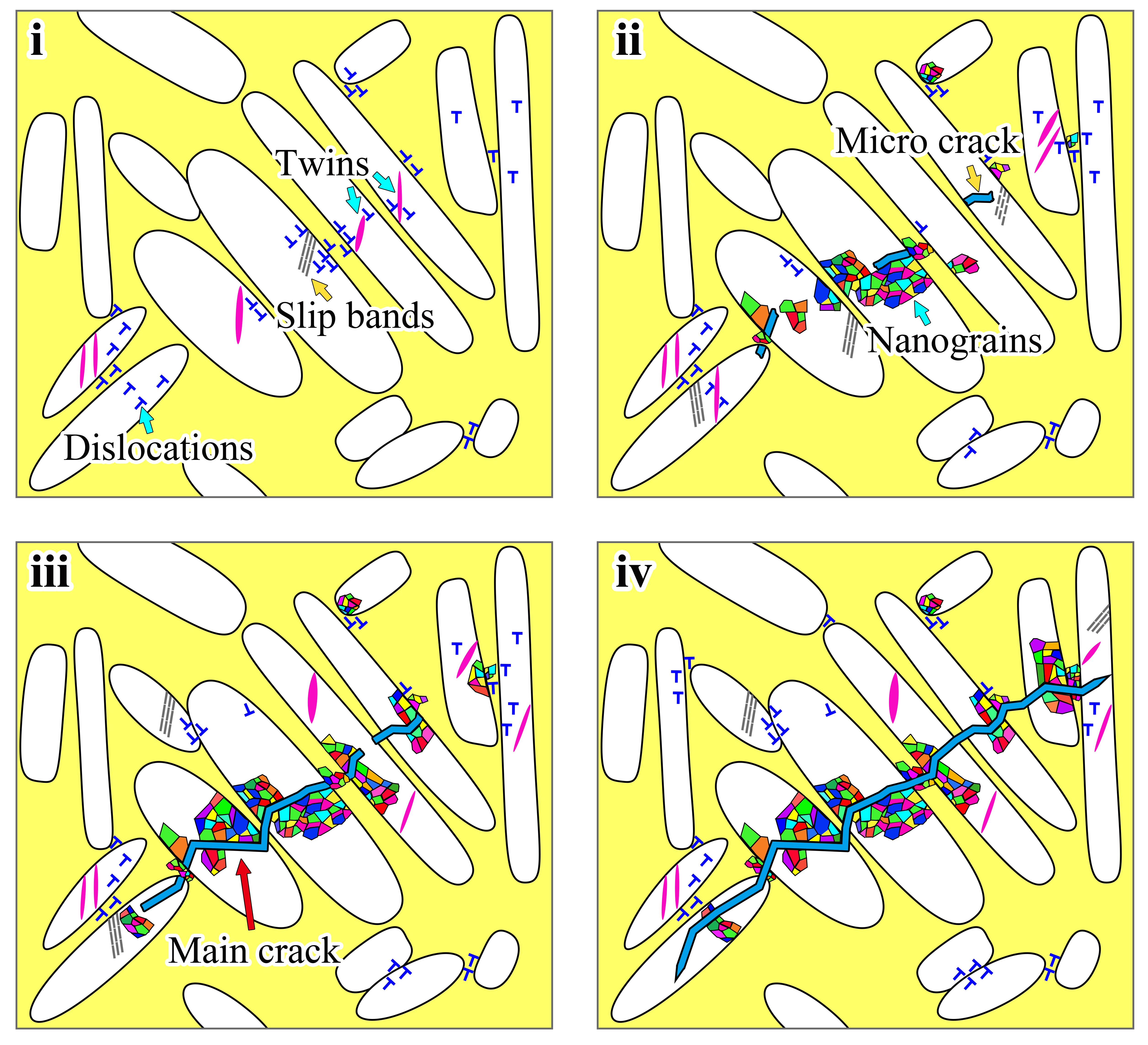图2 钛合金超高周疲劳裂纹萌生和初始扩展机理示意图. (i) 疲劳载荷过程中位错塞积引起的局部高应力诱导孪晶、滑移或微裂纹的形成. (ii) 孪晶系统或位错之间的相互作用导致位错胞或位错墙的形成,进而形成微尺度滑移带和亚微米晶粒,最终形成纳米晶粒; 然后,微裂纹沿着纳米晶粒-粗晶粒界面或在纳米晶粒区域内形成. 此过程中,由于微结构不均匀或变形不协调,微裂纹的形成也可以与晶粒细化无关,即微裂纹形成于α相团簇、较大的α相或α-β界面. (iii) 微裂纹增长或联接,并在疲劳载荷过程中进一步诱导晶粒细化或微裂纹的形成. (iv) 过程(iii)继续,直到裂纹萌生和初始扩展阶段结束.