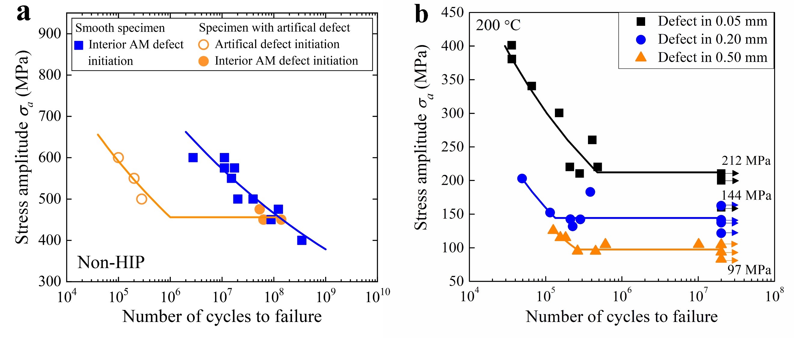 图4 缺陷引入形式和缺陷尺寸对疲劳性能的影响. (a) 缺陷引入形式对增材TC4疲劳性能影响. (b) 人工表面缺陷对TC17钛合金疲劳性能影响. 实线表示双对数坐标下线性拟合得到的中值S–N曲线.